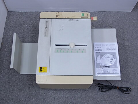 折れる用紙幅 148mm〜297mm A5、B5、A4、B4、A3 画用紙サイズ 紙質 更紙〜上質紙〜画用紙(45gm2/〜150g/m2) 用紙積載量 300枚 (更紙の場合) 折る速さ 120枚/分 (A3版・50Hzの場合) 印字方式 7ピンインパクトドット方式 印字内容 日付・曜日・時・分・実働時間 印字欄 4欄印字+時間数1 インキング インクリボン方式 メモリー機能 工場出荷時より停電累計時間3年間 電源 AC100V 50/60HZ (消費電力:40W) 消費電力 通常4.5W 最大35W 外形寸法・重量 424mm(幅)×358mm(奥行)×252mm(高さ)収納時 424mm(幅)×728mm(奥行)×252mm(高さ)使用時 付属品 取扱説明書